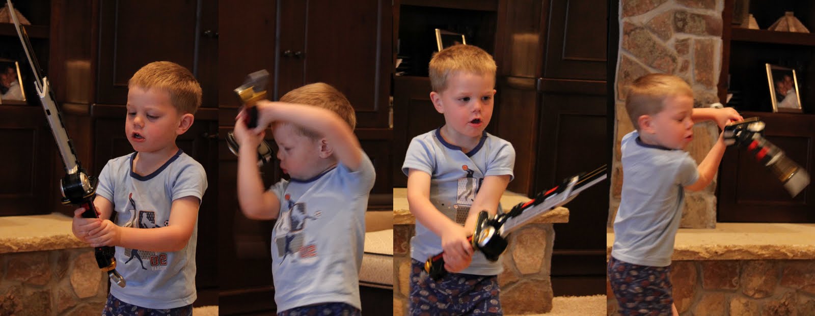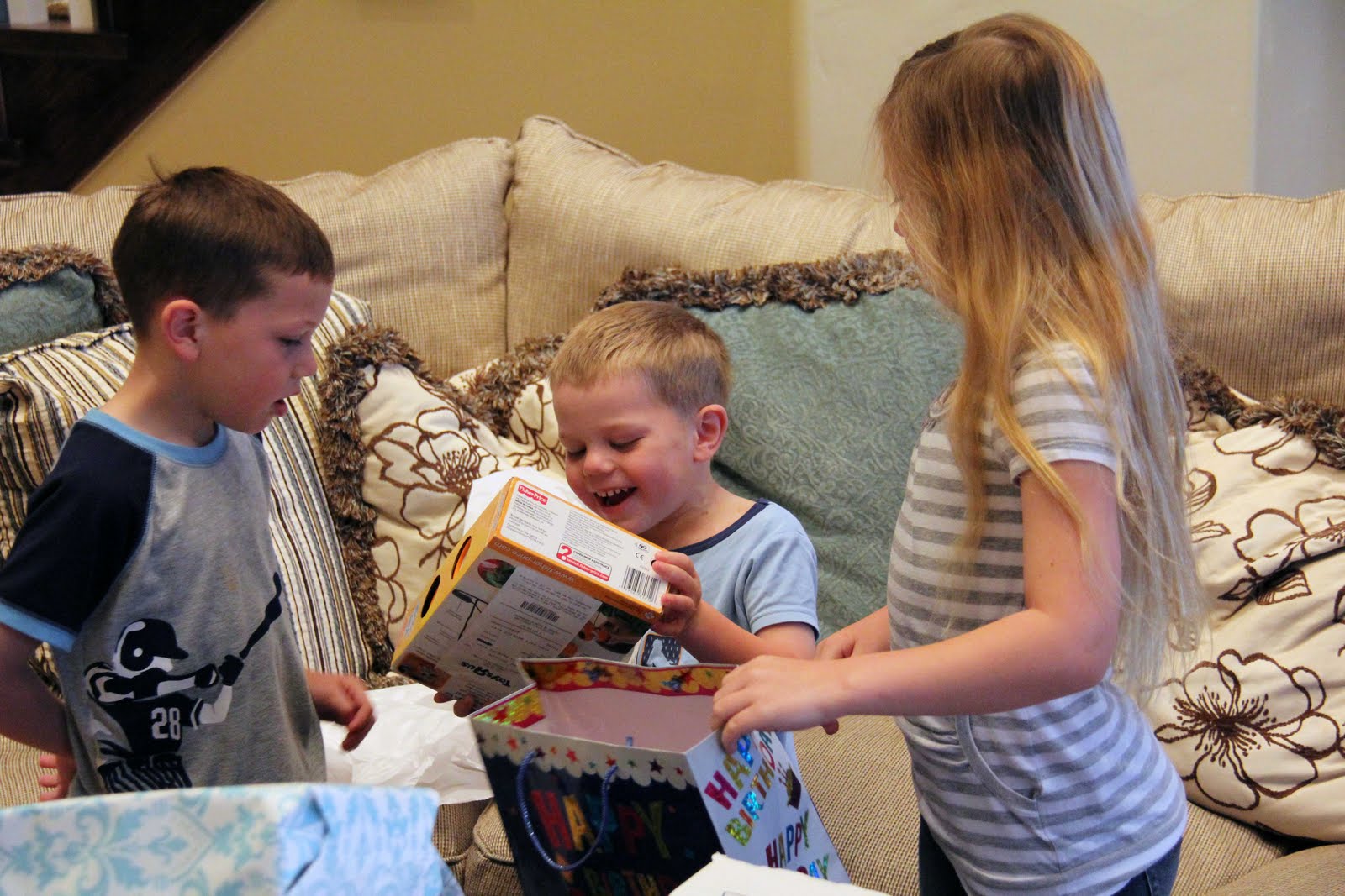 We headed downstairs to open presents, which was adorable. Each new little gift brought greater joy to Davis's face. First the binoculars. Then Spy Kids. Then a triple waterslide. Then a Power Ranger sword and samurizers. Then a cowboy hat and cowboy guns. Then a lasso and a slingshot. (Can you tell that Davis likes fighting and weapons? That's why we call him our little warrior...) When he opened the slingshot, he couldn't contain the joy any longer, and he exclaimed, "Mom! This is what I've been DREAMING about! I love these presents!"
