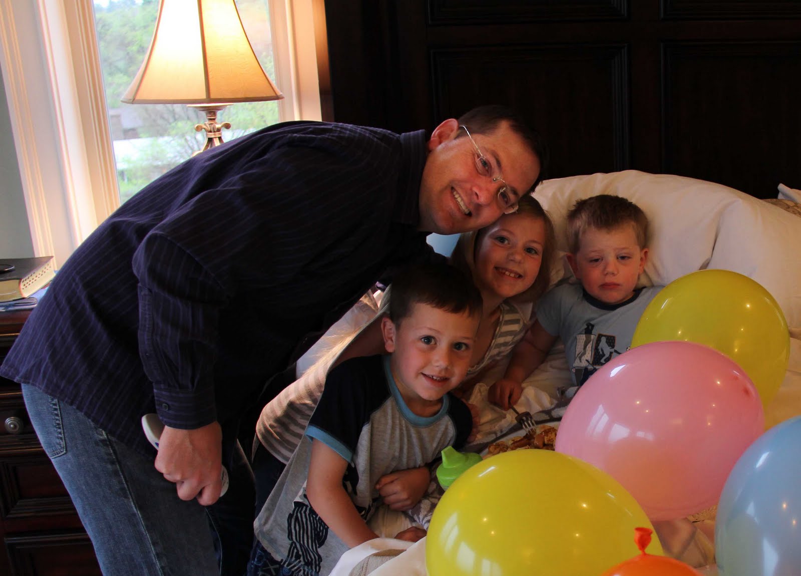 Nothing like french toast and bacon for breakfast in bed. He was soooo tired, but he sat right up and started taking big bites before his birthday song was even finished. He's been dreaming of having breakfast in bed, just like his big brother and sister get on their birthdays.