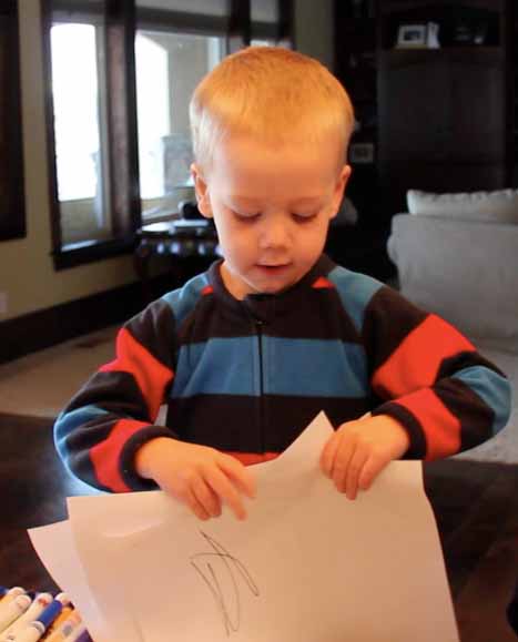 | So many drawings he can't hold them all! |